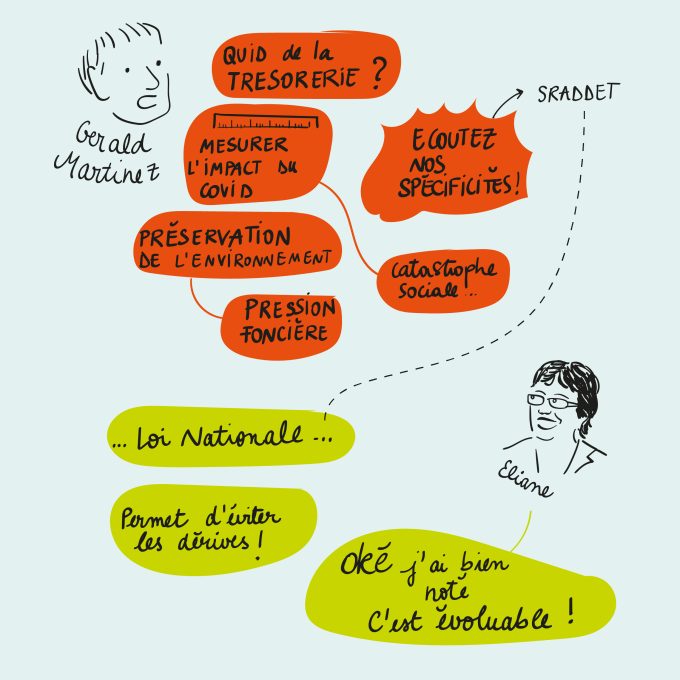 Alors que le forum a réuni près de 300 personnes en visio, les trois temps forts de cette rencontre se sont concluent sur la présentation des dessins que j’ai produit en temps réel. La commande visait à apporter un peu de souffle entre des présentations assez techniques. Je me suis efforcée de saisir en dessin à la fois les messages clés mais aussi les « à-coté » du Forum avec un peu d’humour.