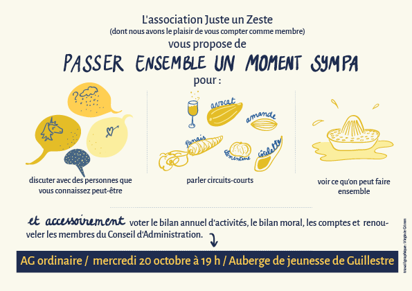 Petite illustration pour une invitation cordiale à l’Assemblée Générale Ordinaire de l’association Juste un Zeste (circuit-court et agrumes).